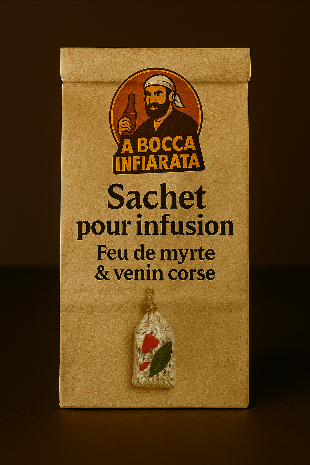 💬 Étiquette : « À Bocca Infiarata – Chjappata di l'Infernu – Piment, baies et feuilles de myrte – Sachet artisanal à usage unique ou semi-suicidaire »